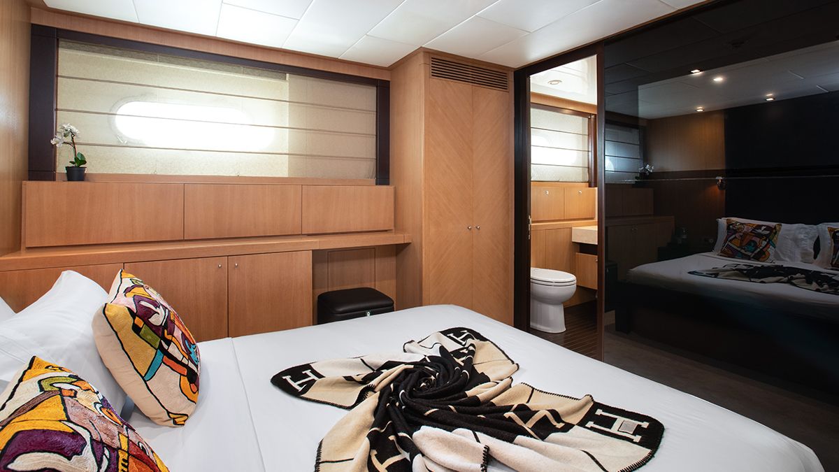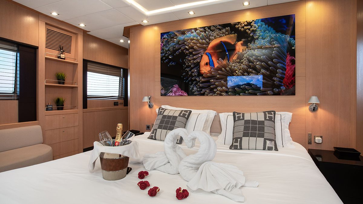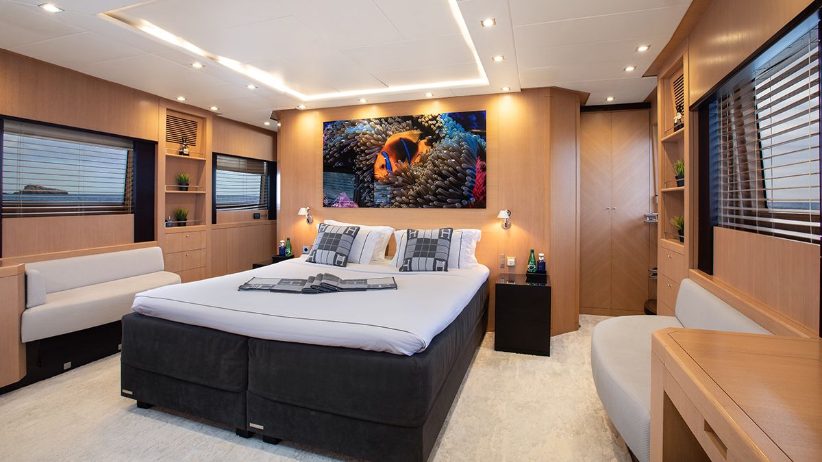 Hauptkabine über die gesamte Breite mit Panoramablick und elegantem Badezimmer
